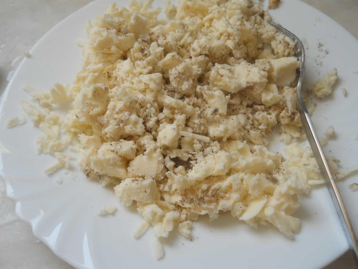 Den Käse zerbröseln und mit dem schwarzen Pfeffer vermischen.